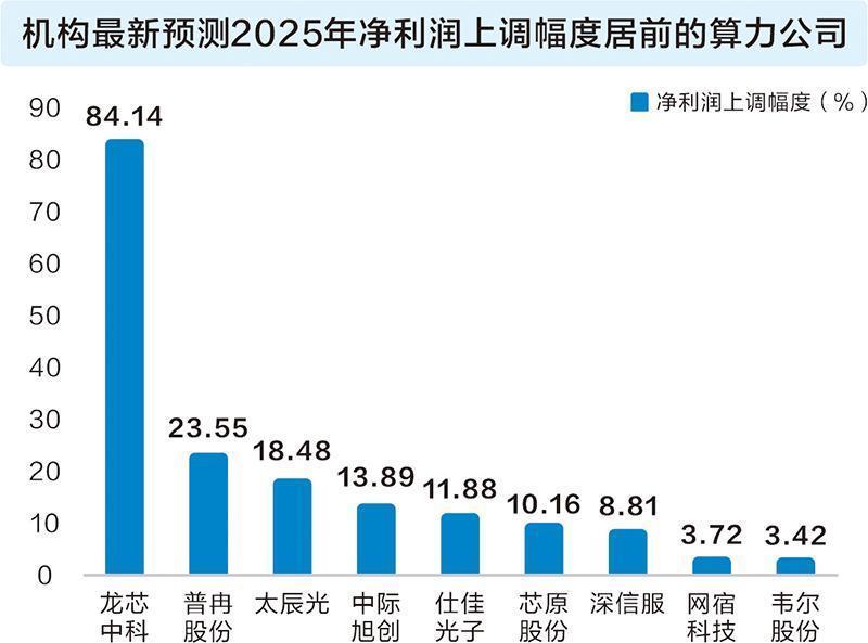 近期,不少算力公司获机构上调2025年盈利预测,表明相关机构对国内算力产业链的看好。以万得算力主题指数成份股为例,龙芯中科、普冉股份、太辰光、中际旭创、仕佳光子、芯原股份6家公司近1月获机构上调2025年盈利预测超10%。网络安全龙头深信服则得到浙商证券青睐,该机构将其 2025 年和2026年归母净利分别上调了8.81%和 7.41%。