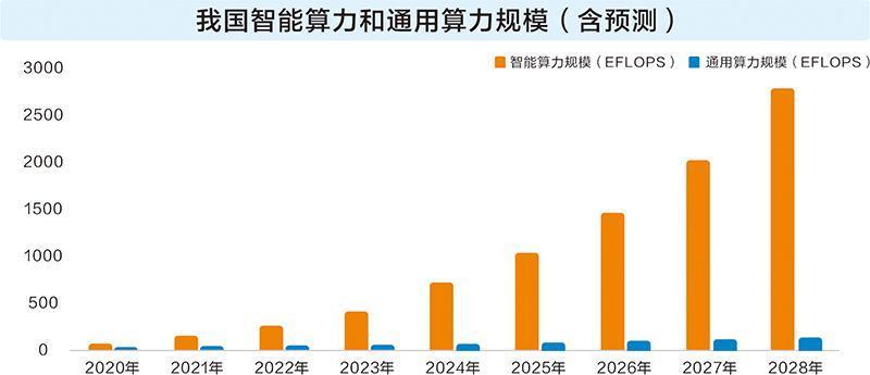 相比通用算力,智能算力的增幅已达到同期通用算力增幅的3倍以上。2024年我国通用算力规模达71.5EFLOPS,同比增长20.6%。据IDC预测,2025年,中国通用算力规模预计达85.8EFLOPS,同比增长20%;智能算力规模将达1037.3EFLOPS,同比增长43%,远高于通用算力增幅。总体来看,2025—2028年中国智能算力规模和通用算力规模年复合增长率预计分别达39.94%和18.31%。