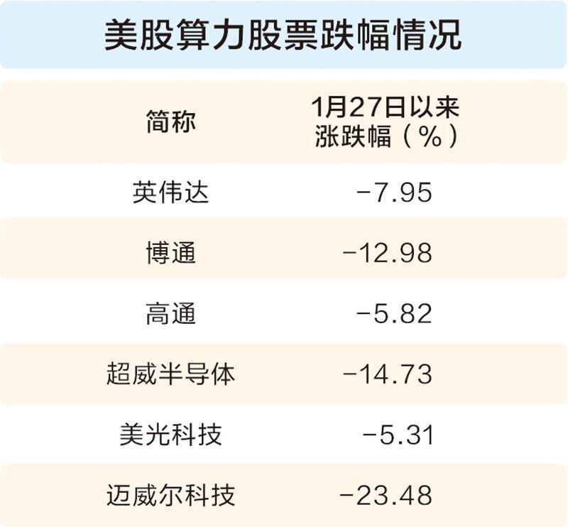 1月27日,英伟达股价暴跌近17%,1月27日以来累计跌幅仍达到7.95%。美股市场的算力股普遍重挫,博通、迈威尔科技1月27日均跌超17%,短暂修复后重回调整,迈威尔科技甚至扩大了跌幅。与此同时,A股算力龙头股价飙升,寒武纪-U和海光信息两大龙头2月以来均涨超30%,并且股价创出历史新高。