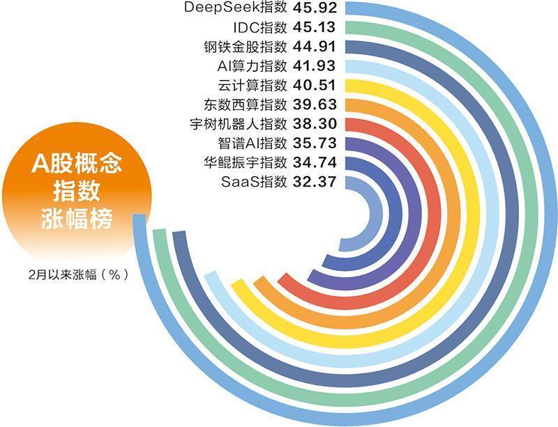 今年以来,深度求索(DeepSeek)概念指数大幅飙升,算力产业链方向涨势尤为迅猛,包括算力租赁(IDC)、云计算、AI算力等指数春节后均飙涨逾40%。